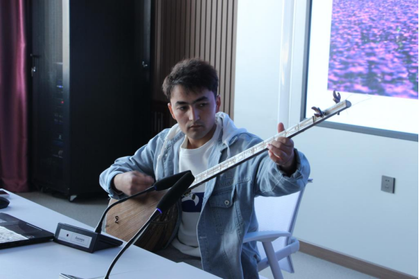 维吾尔族学生展示民族乐器