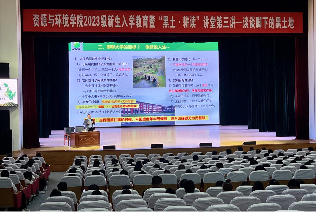 为持续推进新时代耕读教育的新探索、新实践,赓续耕读文化磅礴力量,厚植学子学农爱农情怀。9月23日晚,前黑龙江省农垦科学院院长马守义研究员应邀以“谈谈脚下的黑土地”为题,为我院全体2023级本科新生讲授“耕读讲堂”第三讲暨开学第一课,学院党委副书记许辉主持。400余师生在音乐厅剧场共同聆听。