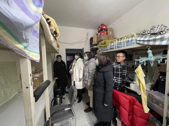 在学生寝室,学院领导和辅导员对学生们的留校生活、饮食及住宿等情况进行了细致深入的了解,并指导他们继续做好疫情防控期间的自我保护。
