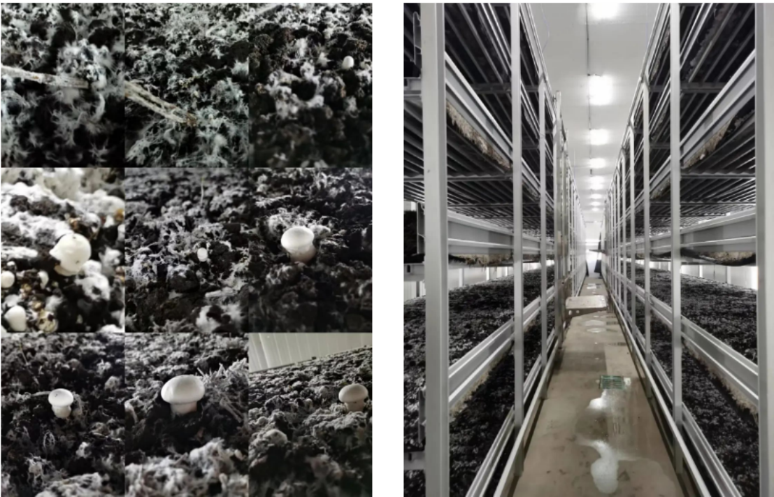 此图名为《双孢蘑菇的成长历程》顺序依次为:1-菌丝集聚;2-出现小菇蕾;3-菇蕾发育;4-菌盖出现;5-菌柄生长;6-菌盖变大;7-菌盖继续变大;8-光滑菌盖出现;9-菌柄菌盖进一步生长。在成长中感受“生命的律动”。