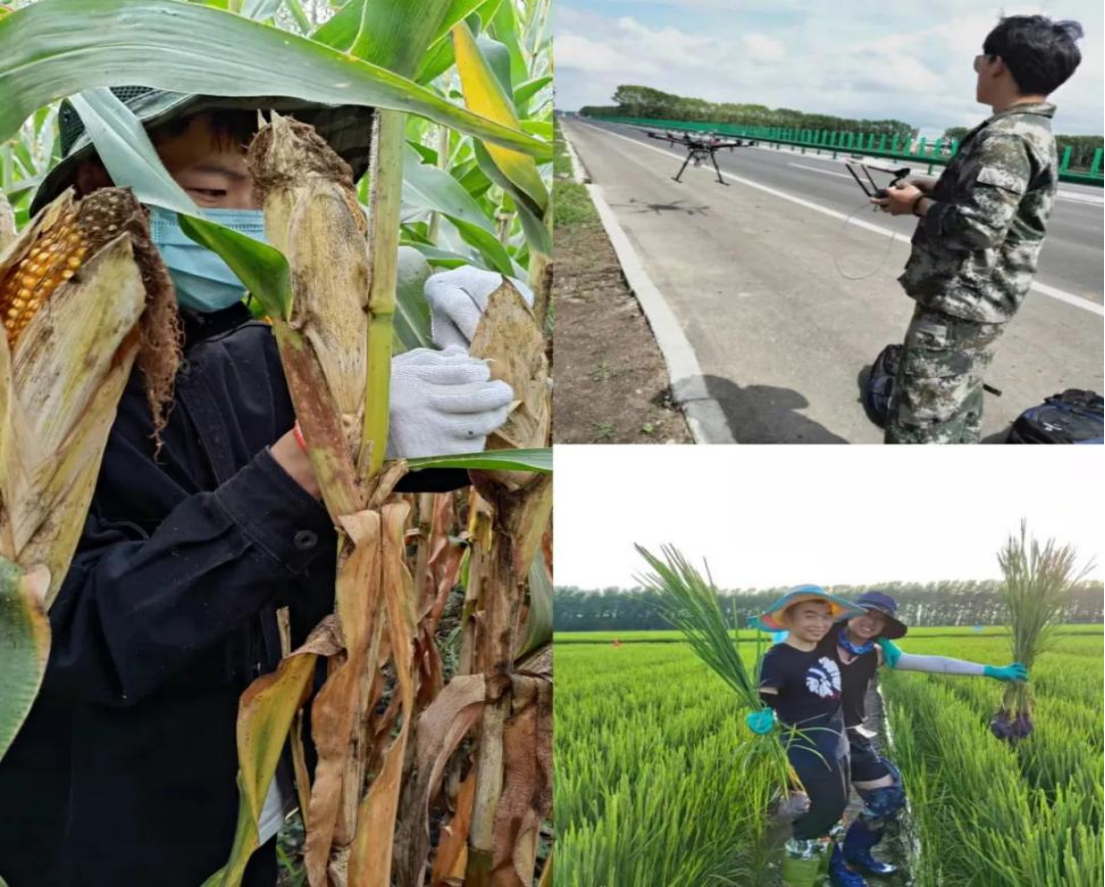 科技小院小队充分发挥专业特点和学科优势,在基层实践中提高农业科技成果转化效率,推动当地生产发展和技术应用。图为队员在农田中开展研究,利用无人机勘测大田中的农作物,为黑土稻米“把脉问诊”,提供技术支撑。