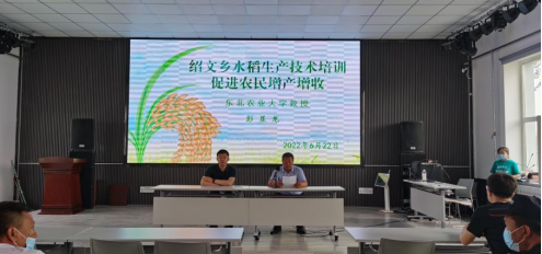 2022年6月22日,彭显龙教授联合黑龙江省农机化技术推广总站农业推广研究员刘波到富裕县绍文乡开展水稻生产技术培训会,对水稻生产中农机农艺问题进行培训,培训后深入田间地头对穗肥施用时期进行实际指导,使农户精准掌握穗肥施用时期,避免因施用时期与用量不合理导致的水稻减产。
