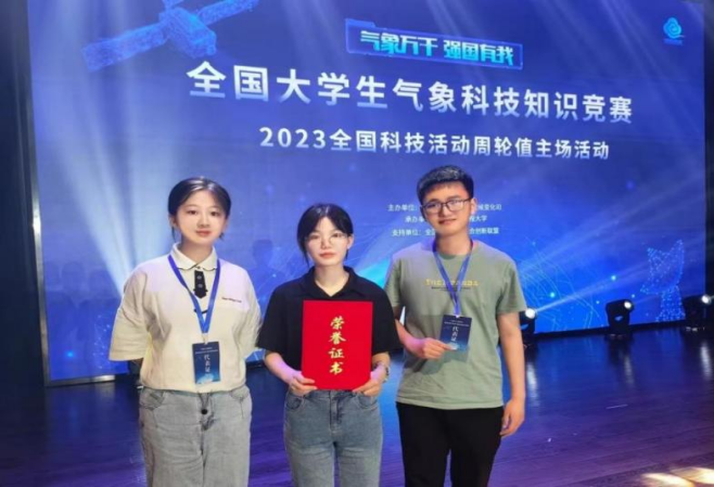 近日,由中国气象局科技与气候变化司举办的“气象万千 强国有我”全国大学生气象科技知识竞赛在南京信息工程大学成功举办。我院学生在气象科技知识竞赛、气象文化创意赛两个赛道中均取得奖项,斩获佳绩。在学院孙彦坤教授指导下,应用气象学专业2020级本科生赵羽飞、杨慧茹和崔红涛同学组成的“五风十雨队”荣获气象科技知识竞赛决赛三等奖;应用气象学专业2020级本科生何俊仪、杜乐、方学程、柳明鑫、华润昕五位同学的作品《遇见节气》荣获气象文化创意赛二等奖。