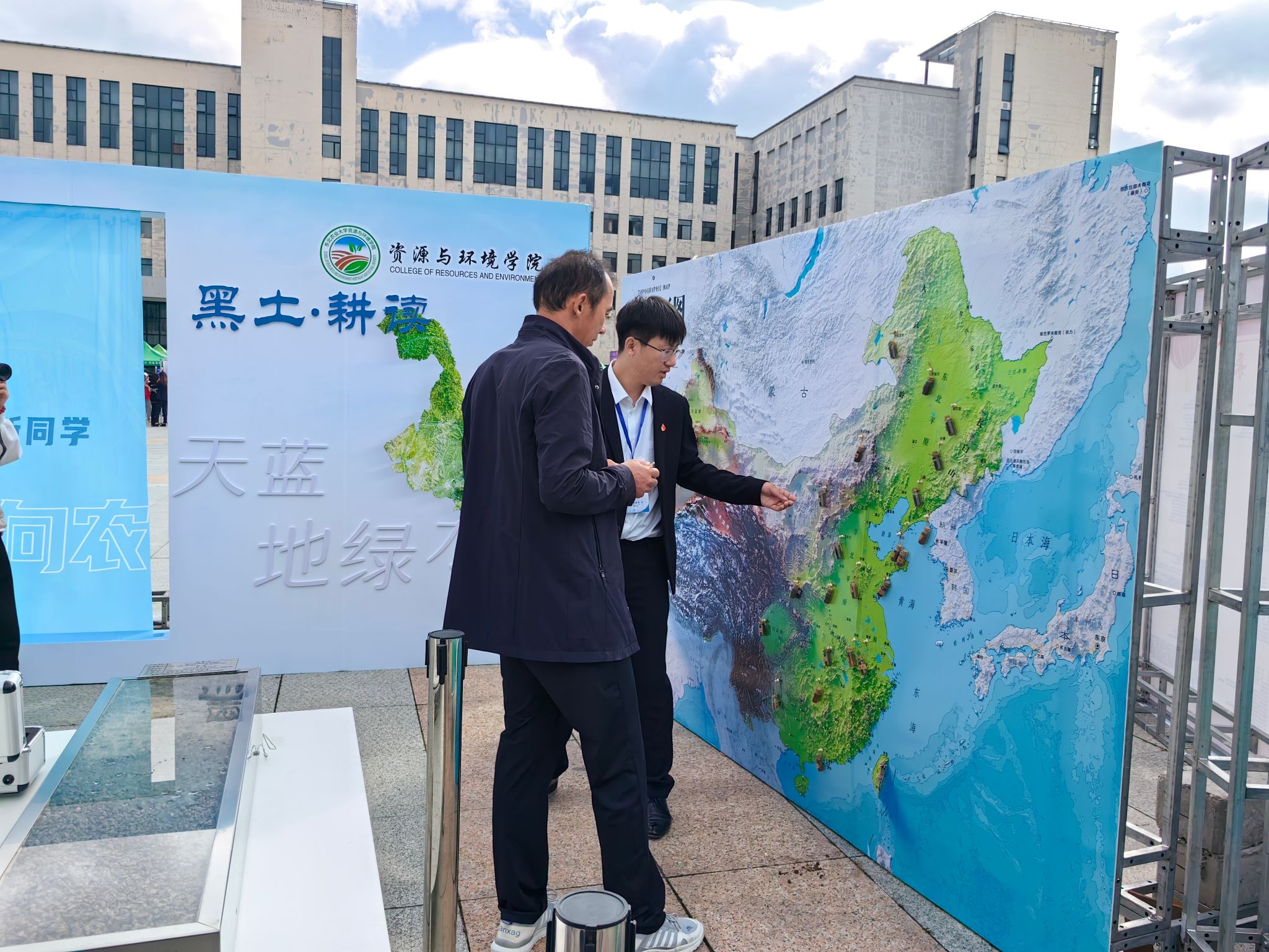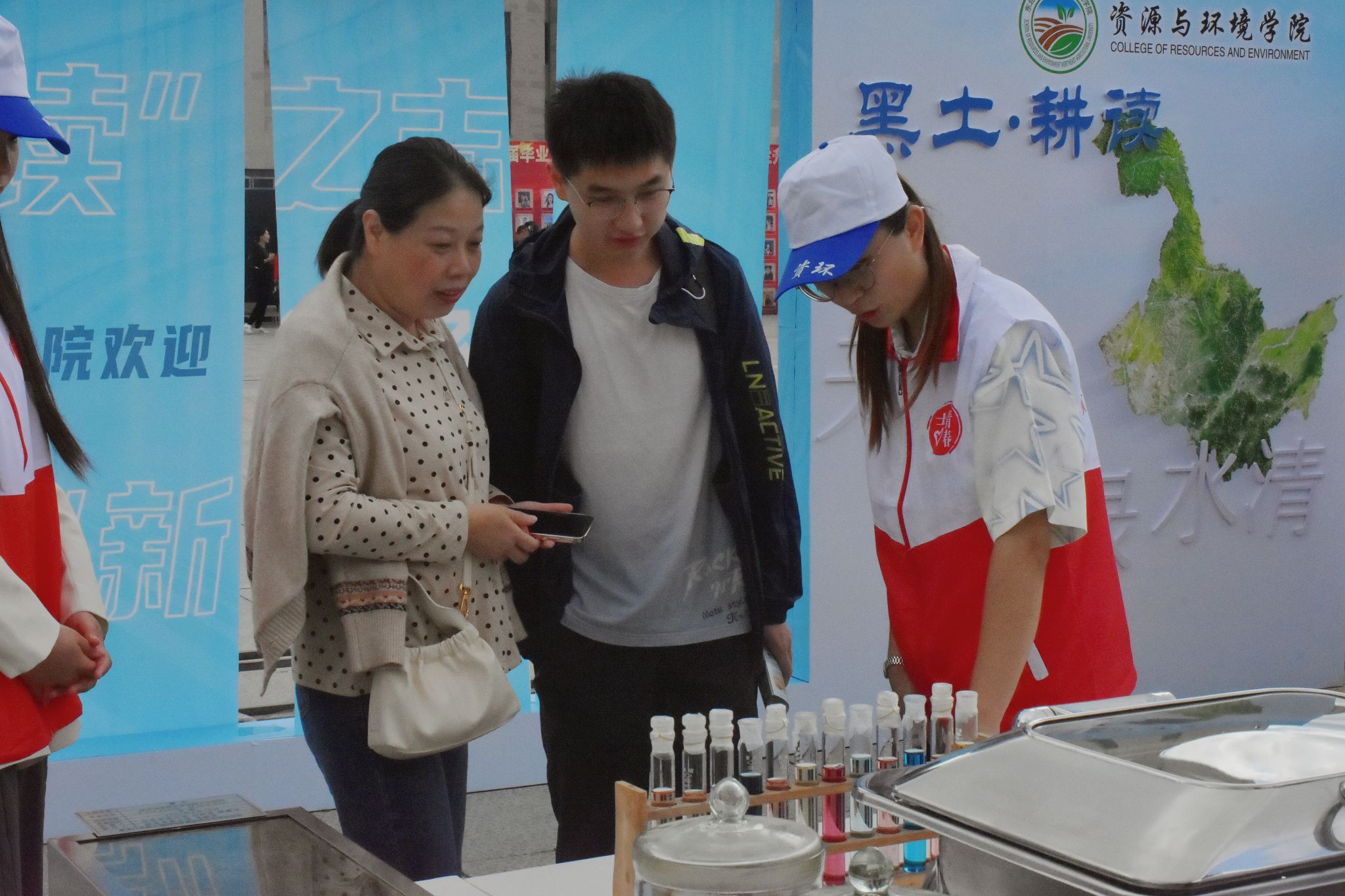 迎新现场,涵盖学院简介、学科介绍、“六分仪”辅导员工作室等6张“旋转式”彰显资环全面工作的宣传板逐一排开,志愿者们细心为家长和新生讲解;土壤标本、气象观测仪、实验试剂、菌类美食等代表专业特色的展品吸引诸多咨询者,让迎新现场成为了最好的“开学第一课”;印有“启梦‘耕读’之志 资环‘新心’向农”的“镂空式”合影墙把资环人传承“耕读精神”的情怀展现的淋漓尽致,新生们积极同父母、老师、朋友合影留念;学院创新理念采用专业魅力打造迎新现场,号召新同学从祖国各地携家乡土样瓶而来,并将实验基础大楼作为迎新打卡参观点,助力学生深入了解、喜爱所学专业,做到迎新有“志”。