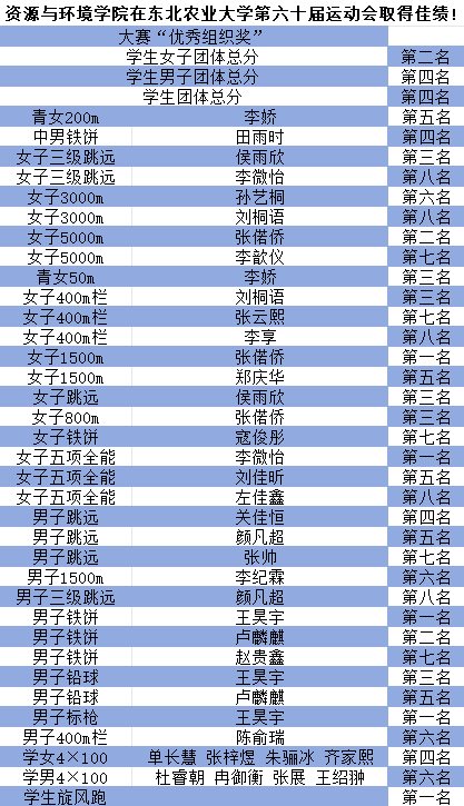 本次运动会中,我院运动员屡创佳绩,在女子1500m、女子五项全能、男子铁饼、男子标枪、学生旋风跑五个比赛项目中斩获第一名,在其余参赛项目中亦斩获多项优异成绩。