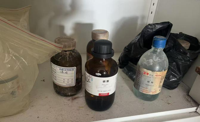 1、违规存放易制爆化学品硝酸。2、药品柜中固液药品混合存放。 |