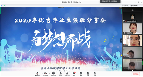 农资1602班王均睿,应生1602班李纤慧,农资1602班田乐,生态1601班王相宜,农资1602班何平,环工1601班曾浈等6名优秀毕业生,分享了大学本科期间的成长过程,学习经验,并强调了疫情防控期间自主学习的重要性。同学们积极与嘉宾互动交流,踊跃提问。