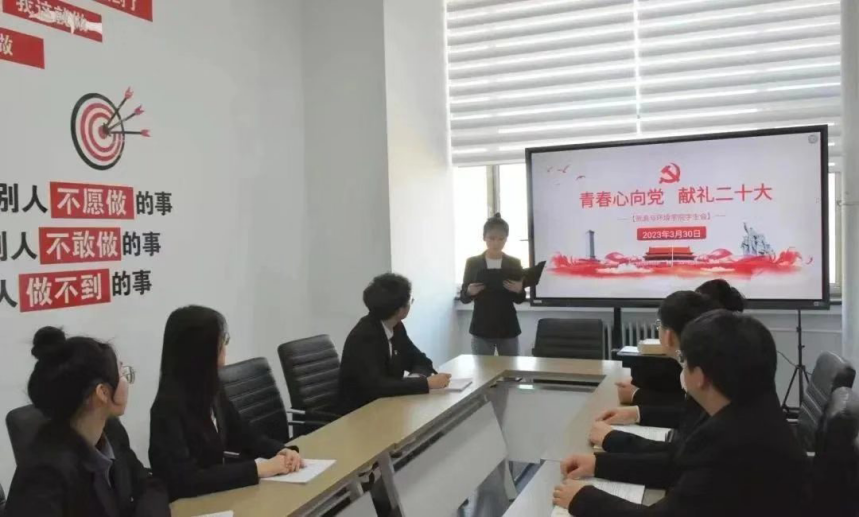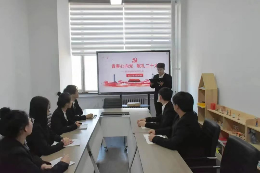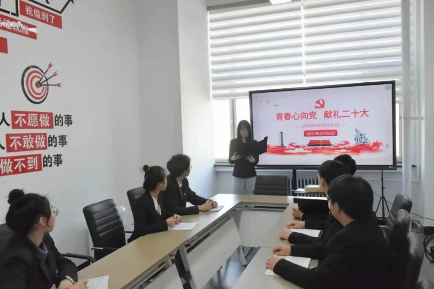 学生会监察调研部部长郝春悦在会议上说到:当青春遇上党的二十大,中国青年奋进之姿态耀眼于整个历史长河:中国青年前赴后继、冲锋陷阵;中国青年自力更生、艰苦创业;中国青年勇立潮头、锐意创新;而今迈向新时代,中国青年不忘初心、牢记使命。正是一代又一代的中国青年以青春之奋进追求民族独立和人民解放,追求国家富强和民族振兴,中国共产党才能欣欣向荣,永葆生机。新时代的中国青年,当毅然决然扛起大梁,勇于攀登、砥砺前行,在经风雨、见世面中长才干、壮筋骨,练就铁脊梁、真本事,以金刚不坏之身应对一切艰难险阻,以奋楫勇毅之姿抵挡一切惊涛骇浪。