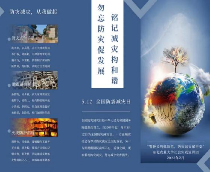 为了普及乡村对于气象灾害防震减灾知识,团队制作打印了关于气象灾害种类、紧急情况自救方法、了解防震减灾日的宣传海报,并分别前往黑龙江省佳木斯市汤原县鹤立镇强盛村、山东省临沂市兰陵县鲁城乡东石门村、重庆市荣昌区进行线下走访宣传,补足民众对于相关知识的欠缺。实践团将继续深化此次社会实践成果,为气象防灾减灾工作贡献青年力量。