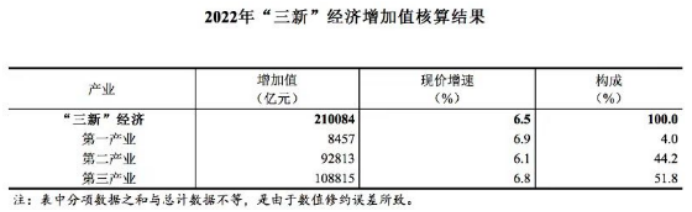国家统计局7月28日发布的数据显示,经核算,2022年我国“三新”经济增加值为210084亿元,比上年增长6.5%,比同期国内生产总值(GDP)现价增速高1.2个百分点;相当于GDP的比重为17.36%,比上年提高0.11个百分点。