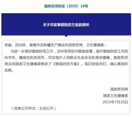 新华社北京7月27日电 记者27日从国家疾控局获悉,国家疾控局、国家卫生健康委近日联合制定印发了《猴痘防控方案》,旨在及时有效应对猴痘疫情,提升猴痘防控工作的科学性、精准性和有效性。