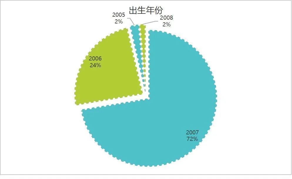 若按出生年份给新生“分班”,2007年出生的203人绝对是“大班”,2006年的158人紧随其后,这两个年份的新生加起来占了总数的90%。