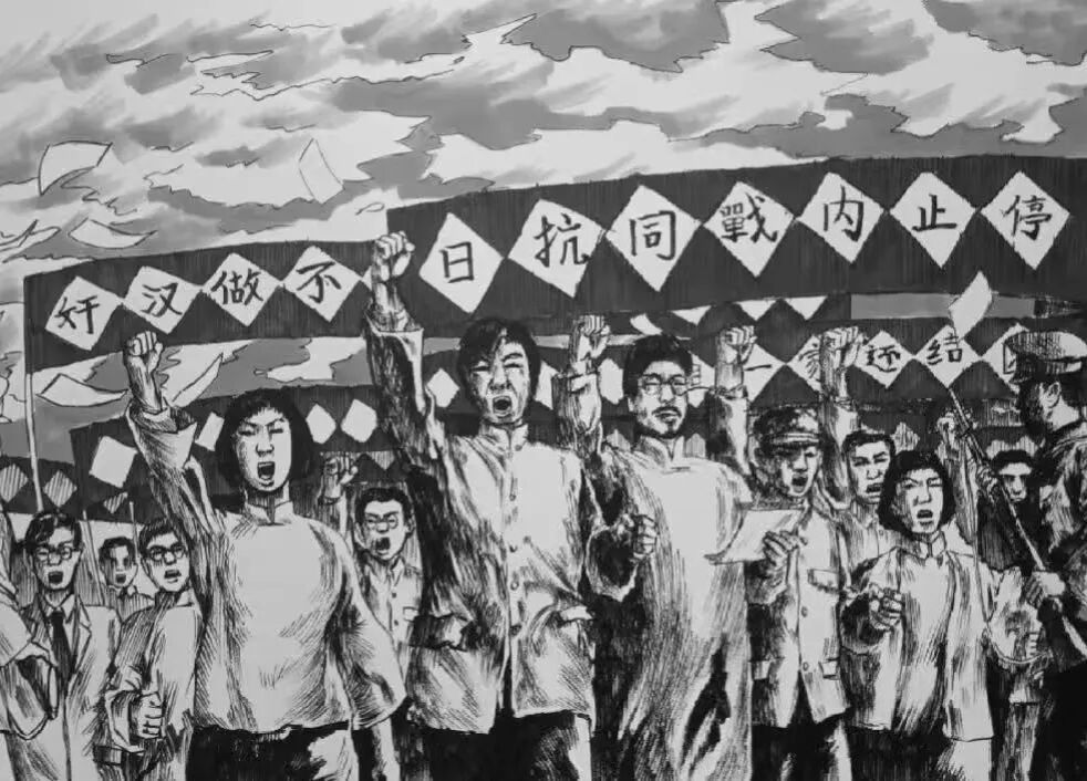 1935年,日本制造“华北事变”,策动“华北自治”,国民政府却奉行“攘外必先安内”政策,华北局势危在旦夕。12月9日,北平数千名大中学生冲破军警阻挠,走上街头游行示威,高呼“停止内战,一致对外”“打倒日本帝国主义”等口号,遭到军警镇压。12月16日,北平学生再次举行大规模游行,多地学生纷纷响应,形成全国性的抗日救亡浪潮。一二·九运动是中国共产党领导下的大规模学生爱国运动,它掀起了全国抗日救亡运动的新高潮。